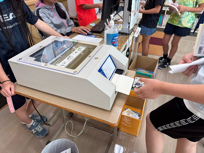 - 図書館と町内の小中学校に[通帳機]を1台ずつ導入していただきました。